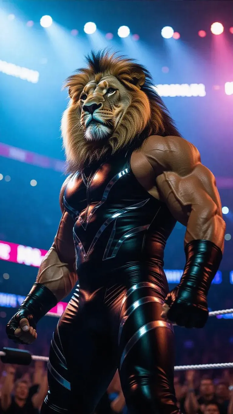 An anthropomorphic lion gladiator enters a professional wrestling arena, wearing a sleek black wrestling singlet adorned with silver stripes. His powerful muscles ripple beneath the fabric as the camera starts at his feet, slowly panning up to his fierce expression. The crowd roars in excitement, smoke rising with each heavy footfall. He flexes his biceps and chest, his intense gaze scanning the audience with raw ferocity. Dramatic lighting casts vibrant colors, enhancing his imposing figure. The atmosphere is electric with the cheers of the fans.