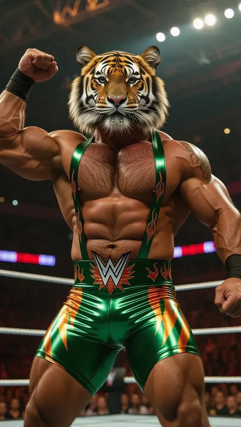 An anthropomorphic tiger gladiator enters a professional wrestling arena, wearing a flashy green wrestling singlet decorated with flames. His muscular physique ripples beneath the fabric as the camera starts at his feet, slowly panning up to his fierce expression. The crowd roars in excitement, energy buzzing with each heavy footfall. He flexes his biceps and chest, his intense gaze peering into the audience. Dramatic lighting creates sharp contrasts, enhancing his dynamic silhouette. The atmosphere crackles with enthusiastic shouts.