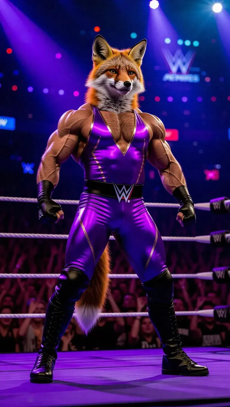An anthropomorphic fox gladiator enters a professional wrestling arena, wearing a sleek purple wrestling singlet with gold highlights. His agile muscles ripple beneath the fabric as the camera starts at his feet, slowly panning up to his sly grin. The crowd roars in excitement, flashing lights illuminating each heavy footfall. He flexes his biceps and chest, his intense gaze scanning the spectators with cunning. Dramatic lighting casts colorful shadows, enhancing his lithe figure. The atmosphere is electric with the fervor of the fans.