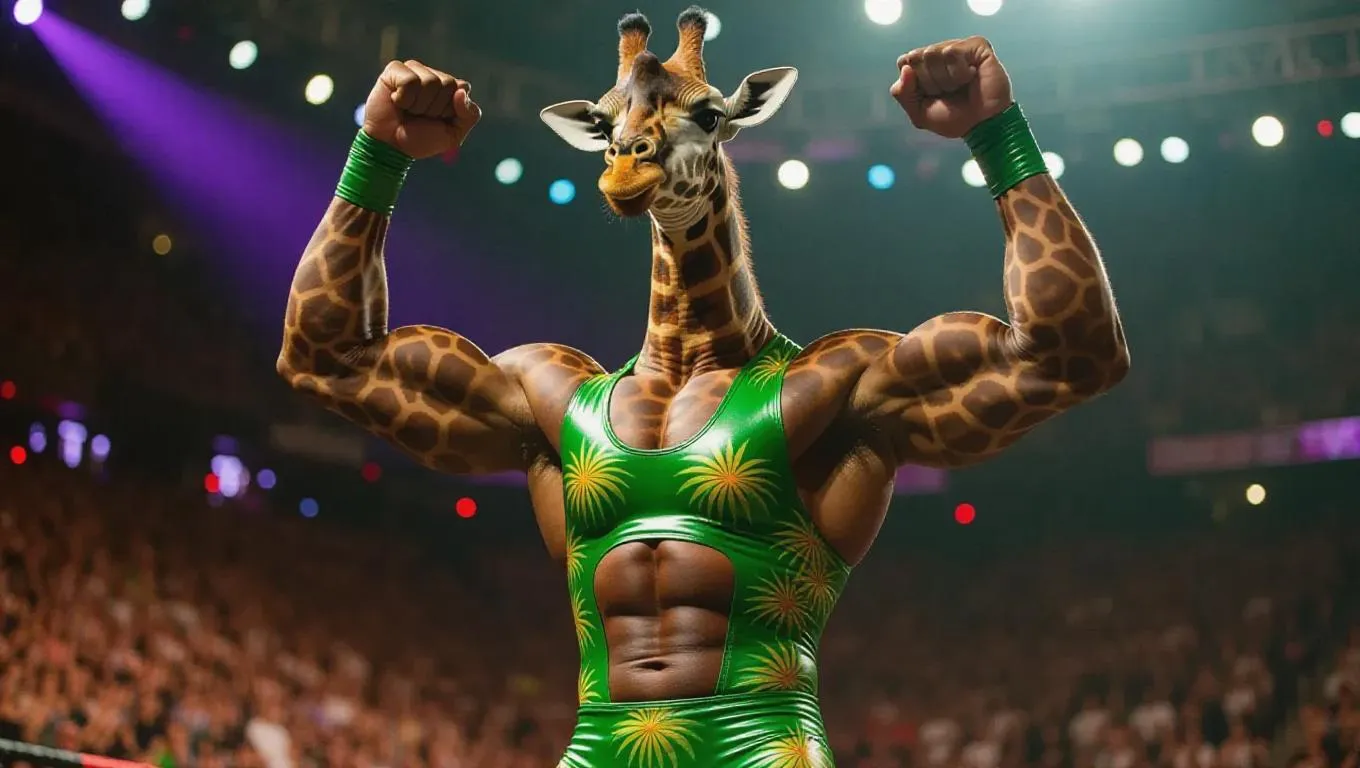 An anthropomorphic giraffe gladiator enters a professional wrestling arena, wearing a bright green wrestling singlet decorated with jungle prints. His long, powerful muscles ripple beneath the fabric as the camera starts at his feet, slowly panning up to his optimistic gaze. The crowd roars in excitement, cheers echoing with each heavy footfall. He flexes his biceps and chest, his intense gaze connecting with the fans. Dramatic lighting adds splashes of color, enhancing his towering figure. The atmosphere is filled with joy.
