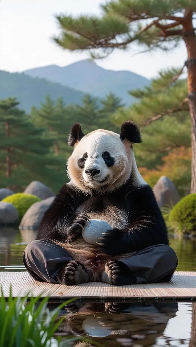 A wise panda meditates in the tranquil gardens of Hokkaido, Japan, holding a smooth stone in one paw. The panda wears a Zen-inspired robe and sits on a soft mat surrounded by fragrant herbs. Calm waters reflect the surrounding pines, and distant mountains provide a serene backdrop. In the background, the stunning peaks of the Daisetsuzan National Park rise majestically. The atmosphere is peaceful, filled with soft whispers of nature and the freshness of the outdoors.