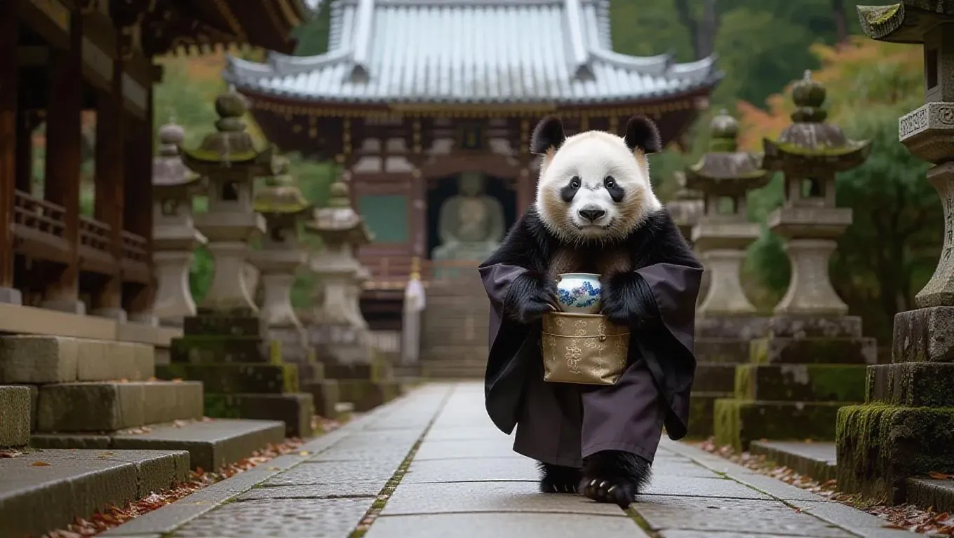 A whimsical panda takes a stroll along the historic paths of Kamakura, Japan, carrying a beautiful porcelain teacup in one paw. The panda is dressed in a flowing cloak and has a small satchel filled with tea blends. Ancient temples and shrines create a picturesque scene, while moss-covered stones add to the charm. In the distance, the Great Buddha stands tall, a symbol of tranquility. The air is perfumed with the scent of incense and the soft sounds of nature.
