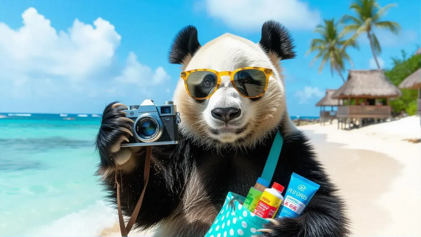 A spirited panda captures memories at the stunning beaches of Okinawa, Japan, clutching a disposable camera in one paw. The panda sports beachwear, including sunglasses and flip-flops, with a beach bag filled with sunscreen and snacks. Turquoise waters glisten under the sun, and palm trees sway gently. In the distance, traditional Ryukyu-style huts dot the coastline, offering a glimpse of culture. The atmosphere is lively with the sounds of waves and laughter.