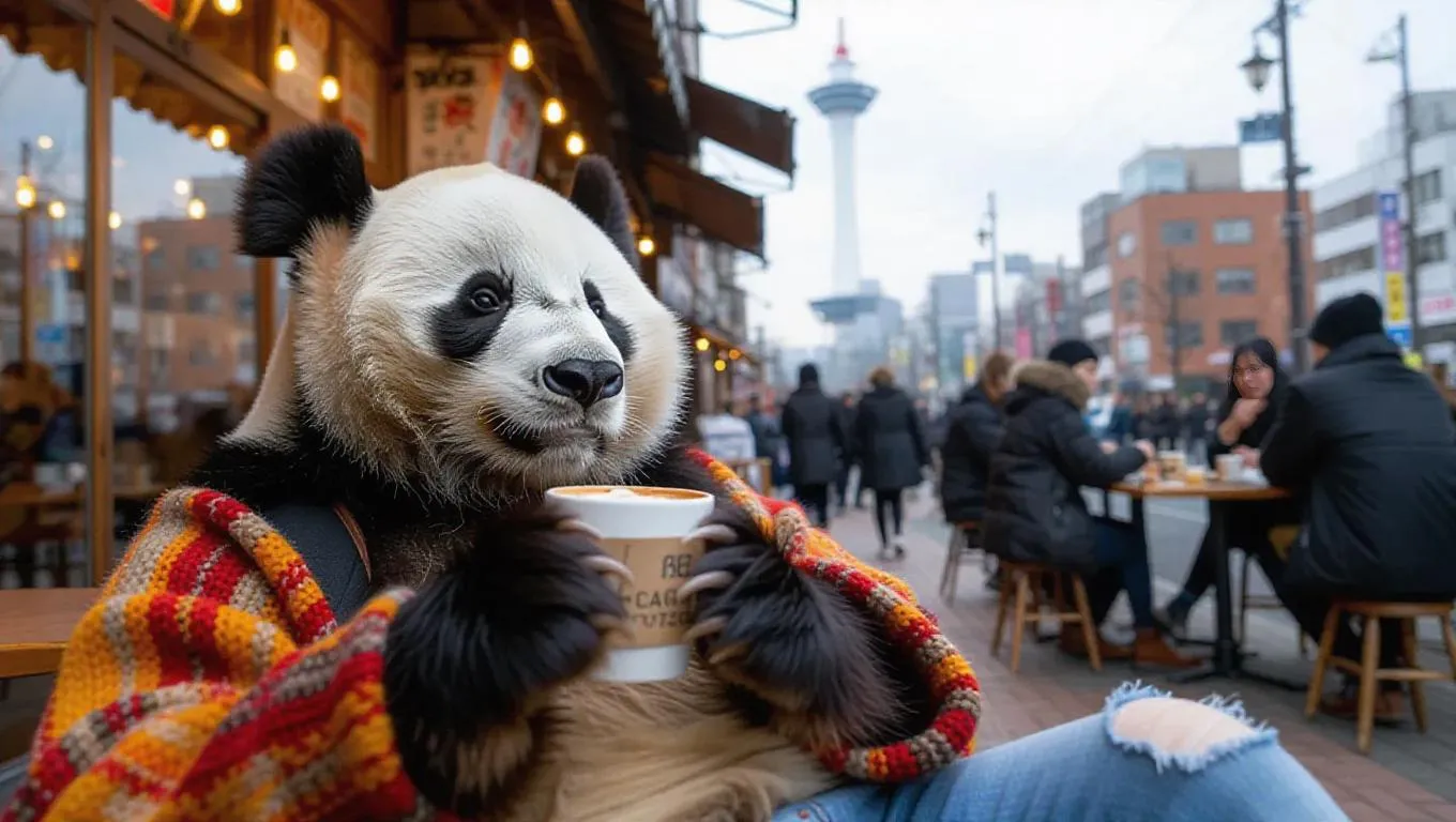 A relaxed panda lounges at a cozy café in Kobe, Japan, holding a warm cup of coffee in one paw. The panda is dressed in a comfy sweater and jeans, with a stylish messenger bag. People share laughter and conversation around, surrounded by enchanting street art. In the background, the iconic Kobe Port Tower stands proudly against the cloudy sky. The smell of freshly brewed coffee fills the air alongside the delightful chatter.