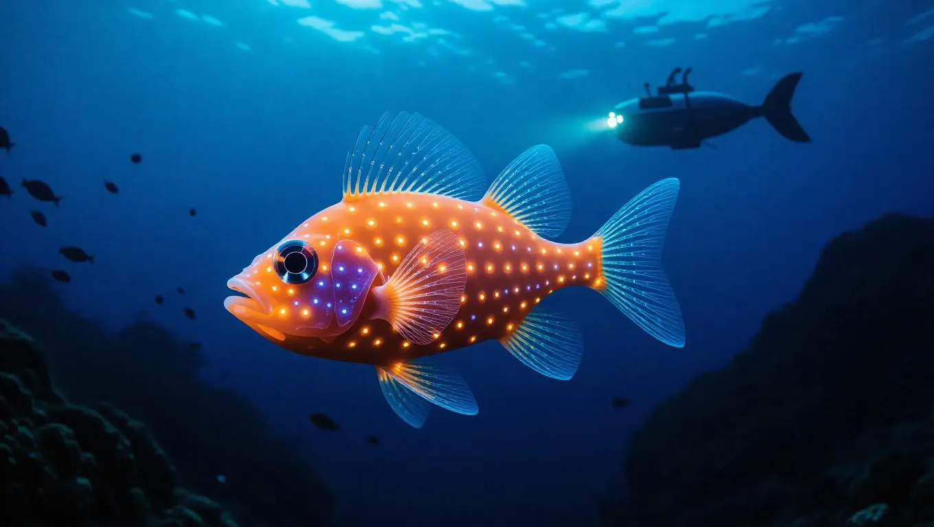 A playful lanternfish glimmers through the dark waters surrounding the Galápagos Islands, Ecuador, its bioluminescent body sparkling like stars. The lanternfish is adorned with tiny glowing jewels and swims gracefully. Surrounding it, deep blue water and shadows create a mysterious ambiance. In the distance, a submersible glides silently, exploring the depths. The atmosphere is filled with wonder.