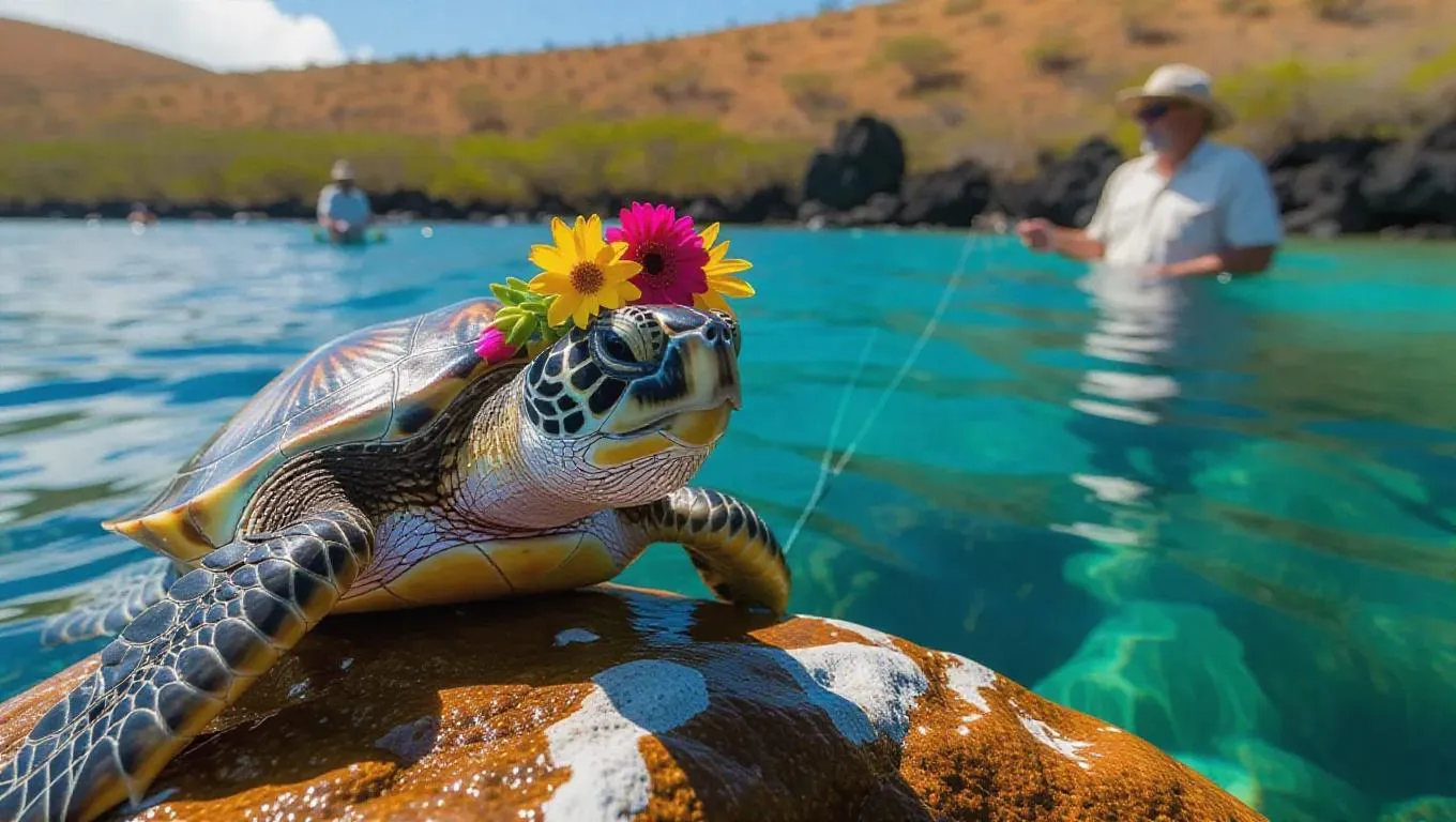 A content sea turtle rests on a warm rock in the Galápagos Islands, Ecuador, its shell absorbing the sunlight. The turtle wears a flower crown and has a peaceful expression, its eyes closed in contentment. Surrounding it, vibrant marine life and shimmering waters create an idyllic scene. In the distance, a fisherman casts a line, patience on his face. The air is filled with relaxation.