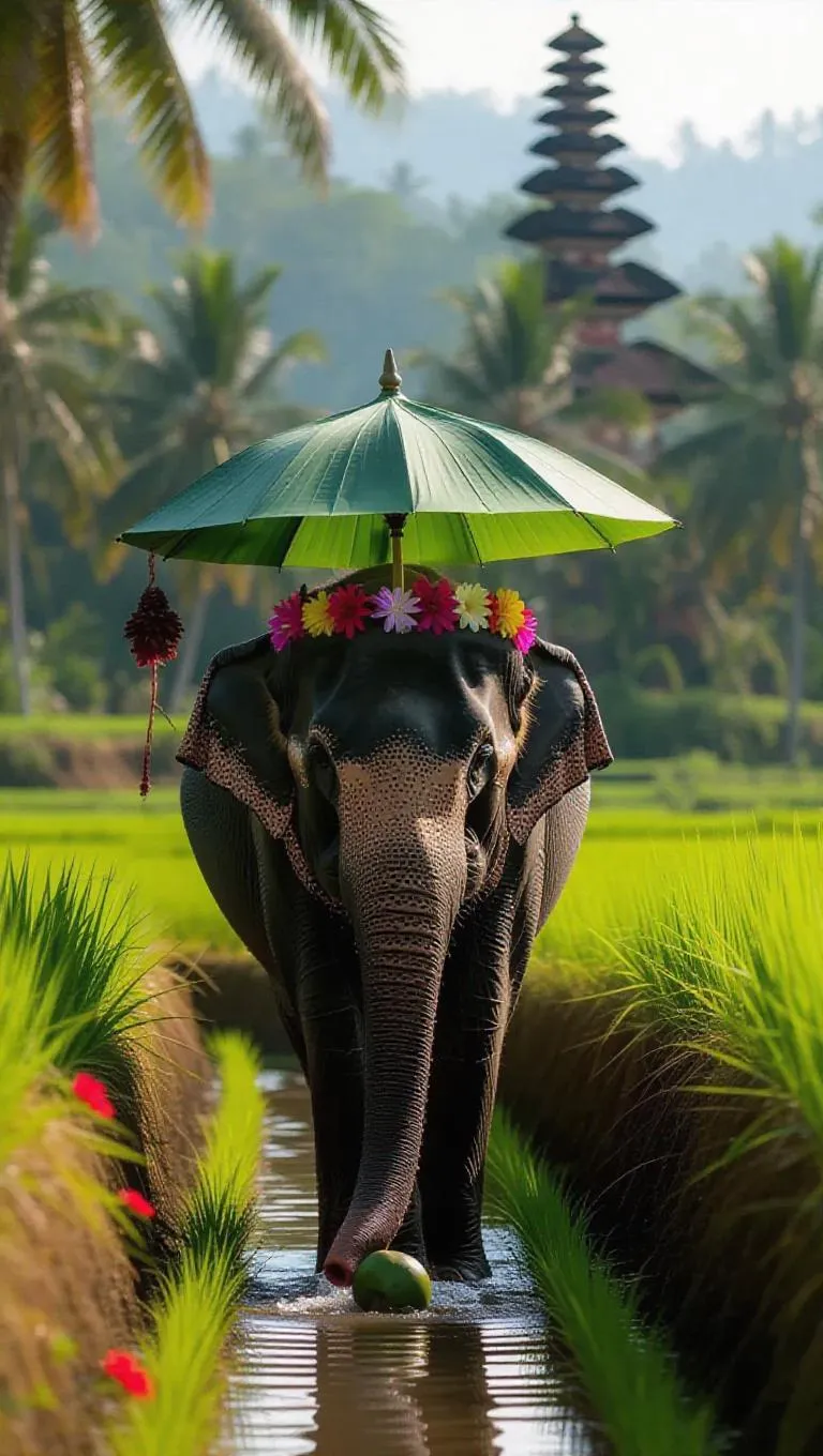 A serene elephant meanders through the tranquil rice fields of Bali, Indonesia, shaded by a tropical leaf umbrella. It wears a beautifully crafted Balinese sarong and a flower crown. Surrounding it are lush green terraces dotted with vibrant flowers, creating a picturesque scene. In the distance, a sacred temple is nestled in the hills. The scent of incense and the sounds of nature fill the air, and the elephant enjoys sipping fresh coconut water, its large ears gently moving with the breeze.