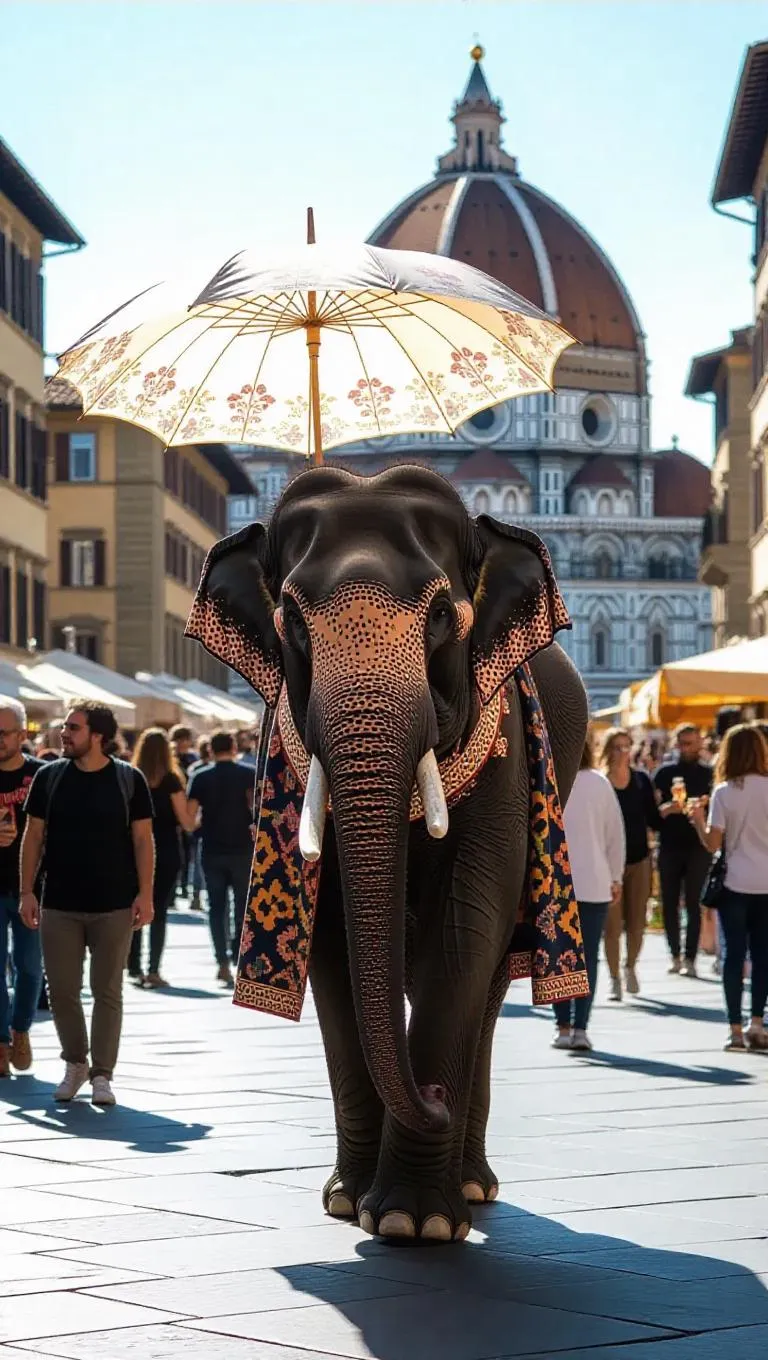 An elegant elephant parades through the lively squares of Florence, Italy, carrying a beautifully crafted umbrella. It adorns a Renaissance-style collar and a patterned cloak. Surrounded by artists and street vendors, the scene is vibrant and full of life. In the distance, the magnificent Duomo proudly stands out. The sound of clinking glasses and cheerful chatter fills the air, and the elephant pauses to enjoy a gelato, its ears flopping playfully in the warmth.