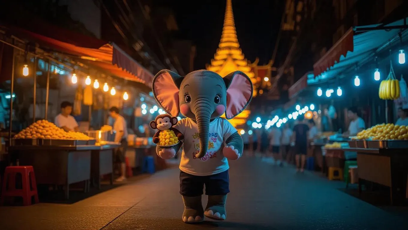 A playful elephant skips through the vibrant streets of Bangkok, Thailand, holding a playful monkey plushie. It wears a modern casual outfit with a T-shirt and shorts. Around it, lively street food stalls prepare dishes that create a delicious aroma. In the distance, the National Temple glows brightly at night. The air is filled with sizzling sounds and laughter, and the elephant stops to eat sweet mango sticky rice, its ears bouncing with excitement.