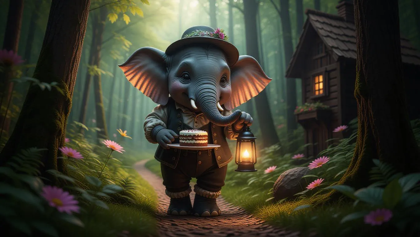 A whimsical elephant roams through the enchanted forests of the Black Forest, Germany, holding a lantern. It wears a traditional Bavarian outfit complete with lederhosen. The vibrant greenery and folklore elements create a magical atmosphere. In the background, a charming wooden cottage peeks through the trees. The sounds of birds chirping and leaves rustling fill the air, and the elephant takes a moment to enjoy a slice of Black Forest cake, its ears flopping contentedly.