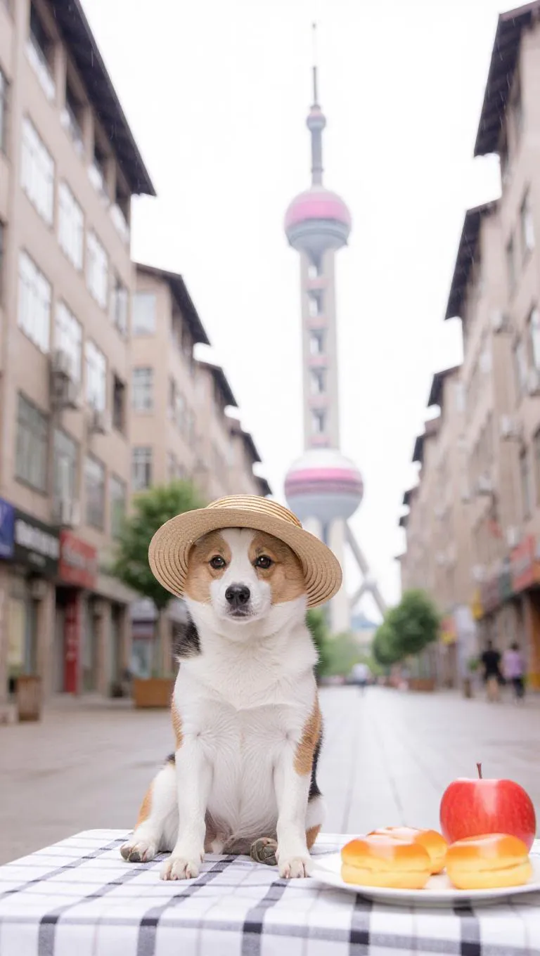 A dog sits on a checkered blanket, wearing a straw hat, and gazes directly at the camera. Behind the kitten, a white tower rises into the sky. To the right of the kitten, there are three pastries on a table next to a red apple. The scene takes place on a city street, with buildings in the background, during a light rain shower.