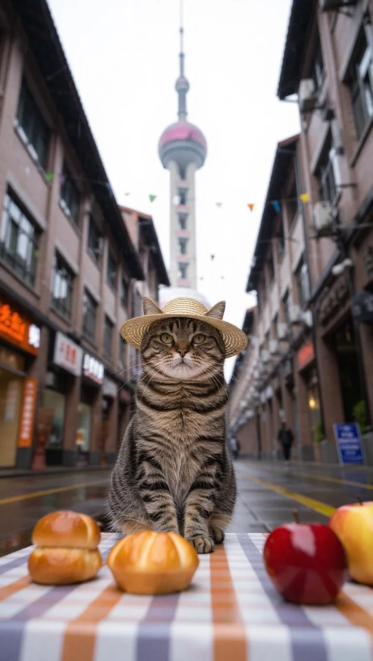A cat sits on a checkered blanket, wearing a straw hat, and gazes directly at the camera. Behind the cat, a white tower rises into the sky. To the right of the cat, there are three pastries on a table next to a red apple. The scene takes place on a city street, with buildings in the background, during a light rain shower.