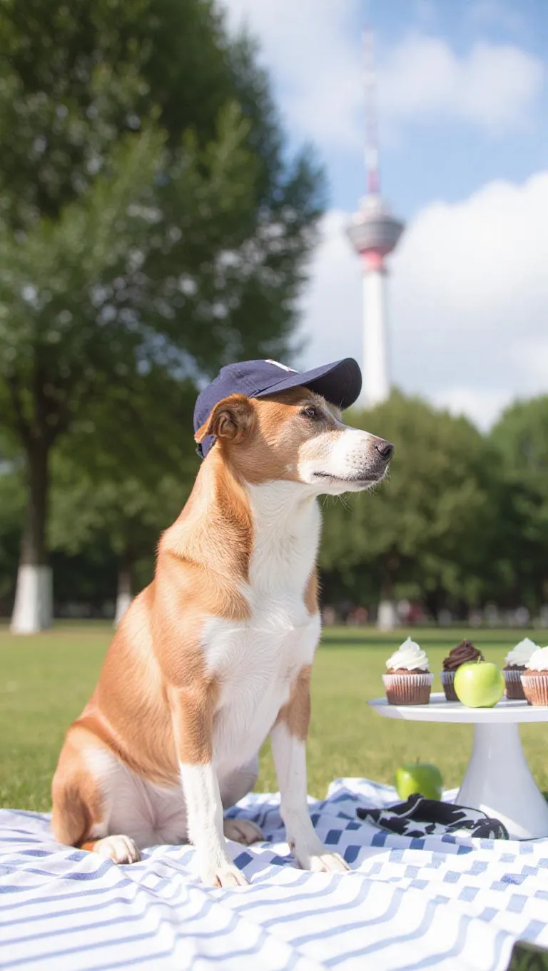 A dog sits on a striped blanket, wearing a baseball cap, and gazes off to the side. Behind the dog, a white tower rises into the sky. To the right of the dog, there are three cupcakes on a table next to a green apple. The scene takes place in a park, with trees in the background, during a sunny afternoon.