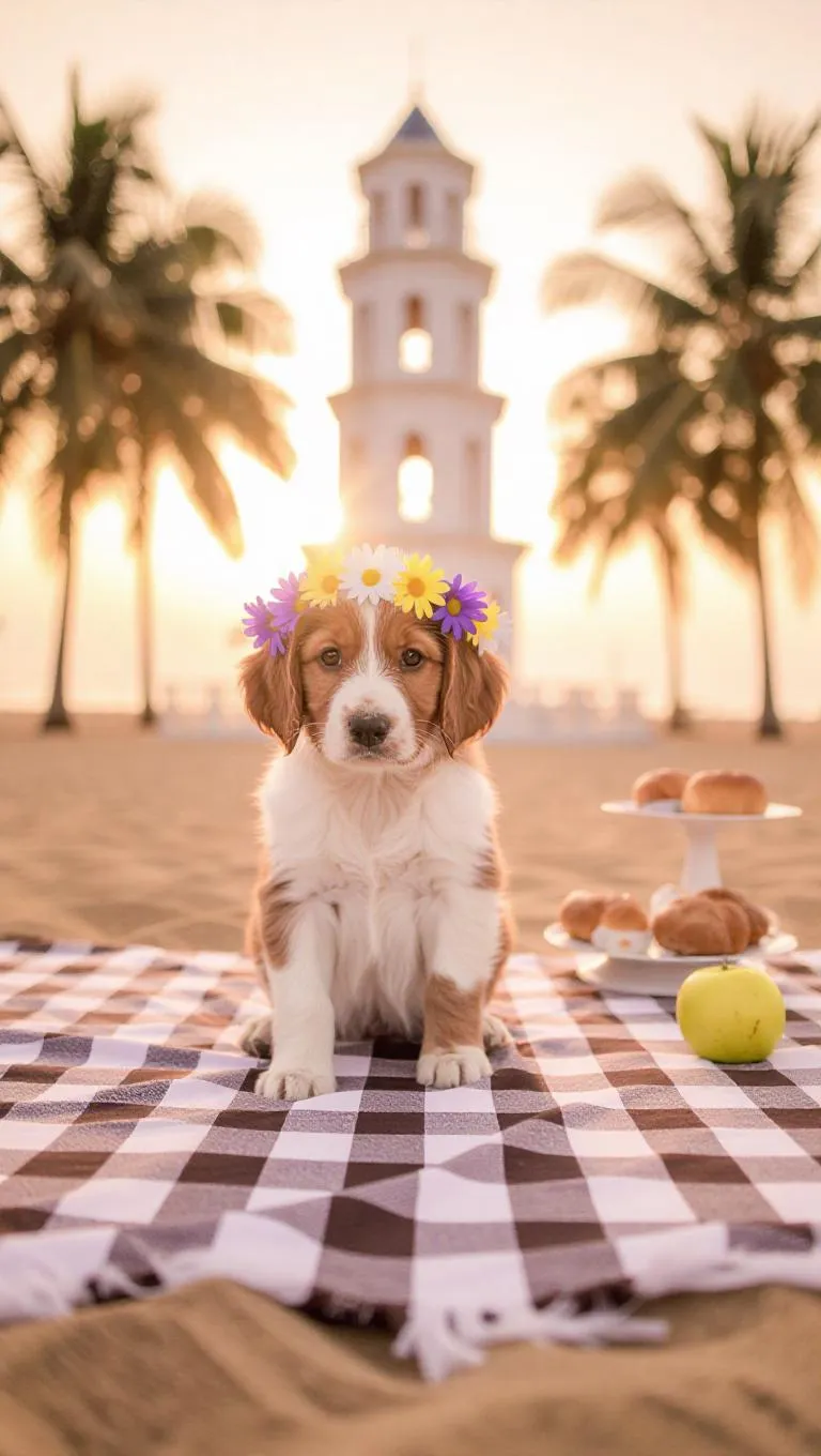 A puppy sits on a checkered blanket, wearing a flower crown, and gazes directly at the camera. Behind the puppy, a white tower rises into the sky. To the right of the puppy, there are three pastries on a table next to a yellow apple. The scene takes place on a sandy beach, with palm trees in the background, during sunset.