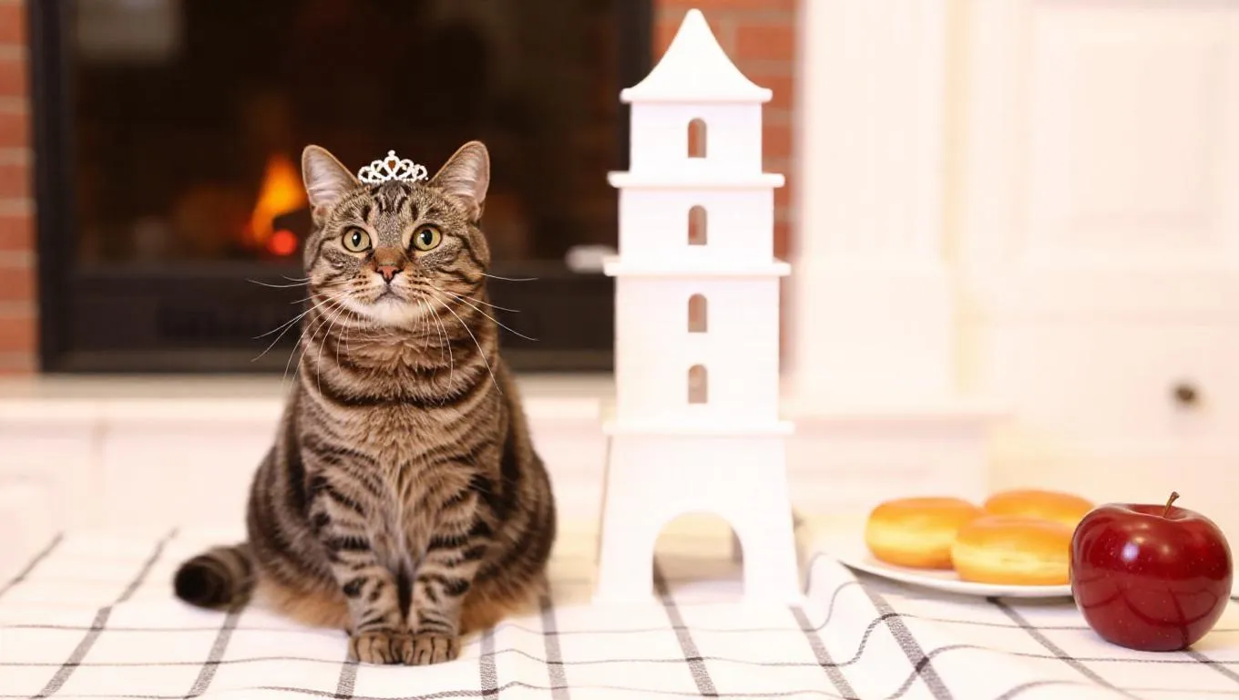 A cat sits on a checkered blanket, wearing a tiara, and gazes calmly at the camera. Behind the cat, a white tower rises into the sky. To the right of the cat, there are three pastries on a table next to a red apple. The scene takes place inside a cozy room, with a fireplace in the background, during winter.