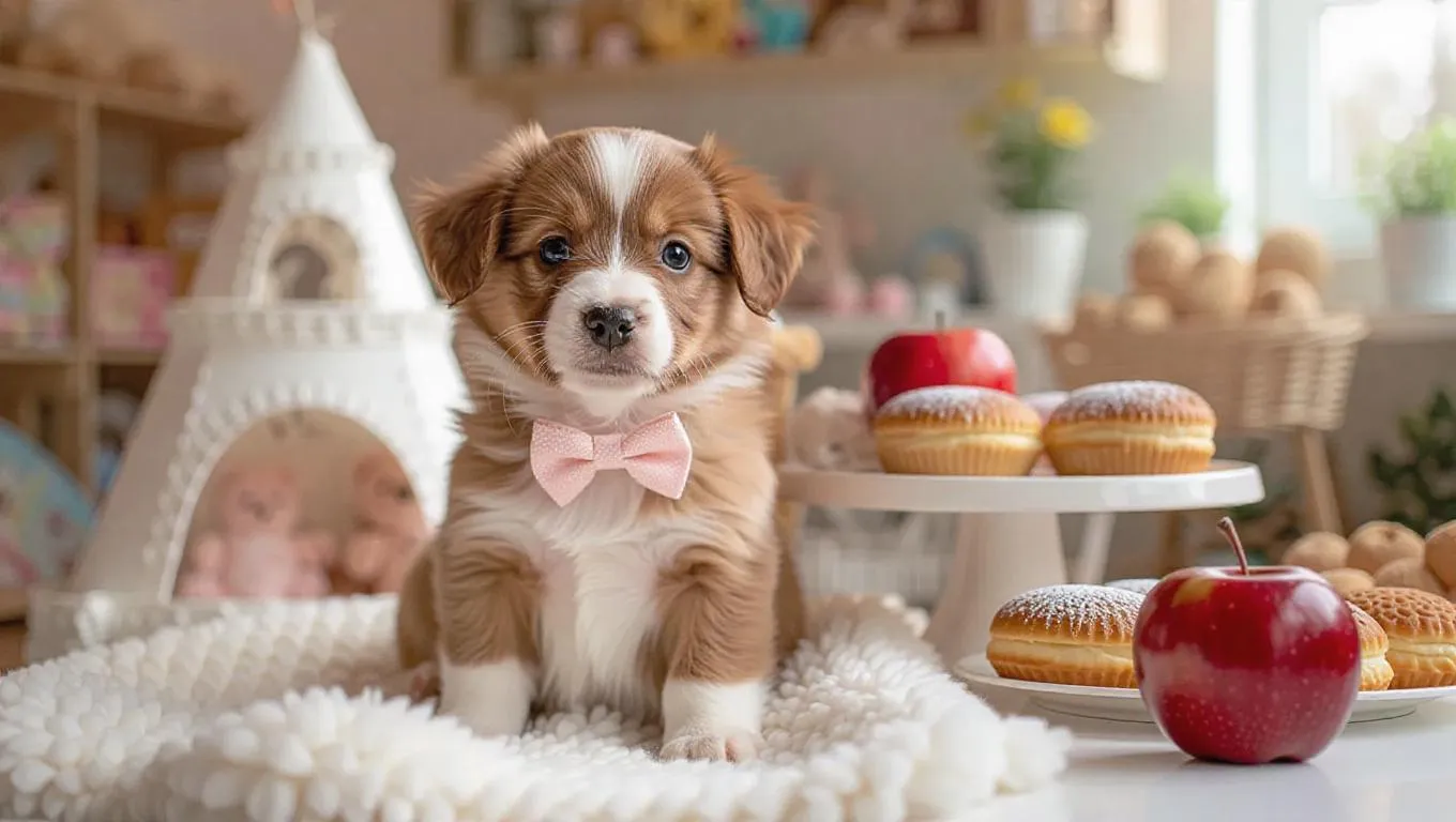 A puppy sits on a cozy blanket, wearing a bow, and looks excitedly at the camera. Behind the puppy, a white tower rises into the sky. To the right of the puppy, there are three pastries on a table next to a red apple. The scene takes place in a pet shop, with toys in the background, during a lively afternoon.