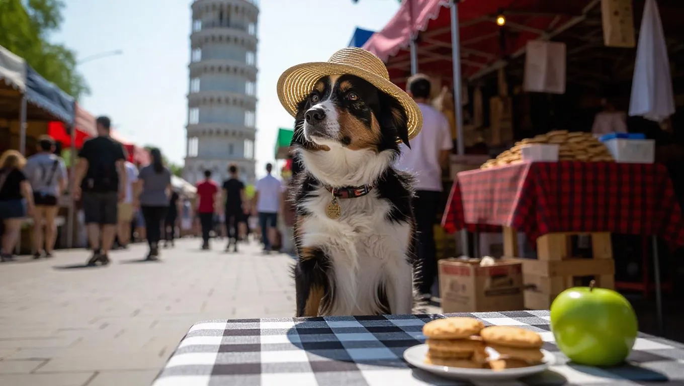 A dog sits on a checkered blanket, wearing a sunhat, and observes the people passing by. Behind the dog, a white tower rises into the sky. To the right of the dog, there are three cookies on a table next to a green apple. The scene takes place in a busy street market, with stalls in the background, during a sunny day.
