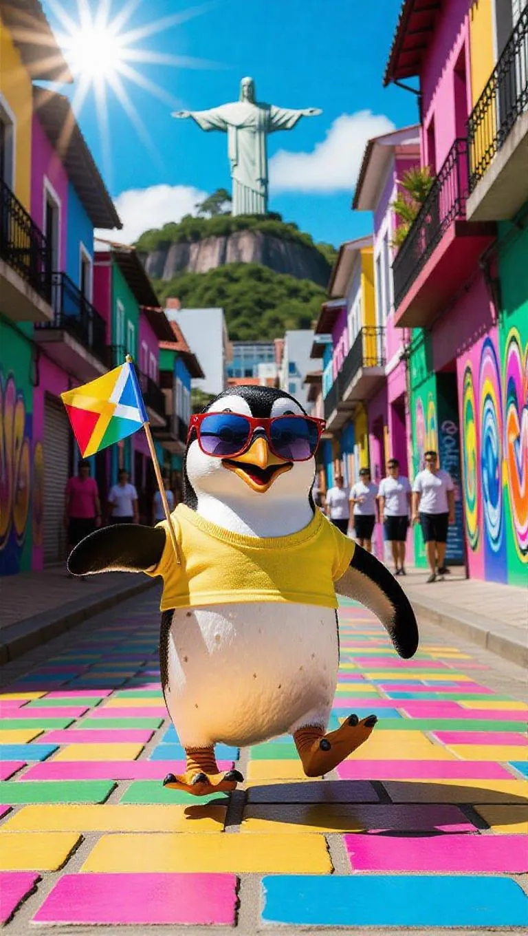 A cheerful penguin waddles through the colorful streets of Rio de Janeiro, Brazil, holding a small flag in one flipper. The penguin wears a bright yellow shirt and a pair of sunglasses, its feathers glistening in the sunlight. Around it, vibrant murals and street art cover the walls, and the sounds of samba music fill the air. In the distance, the iconic Christ the Redeemer statue stands atop Corcovado Mountain, its arms outstretched. The sky is a brilliant blue, with the sun shining brightly.