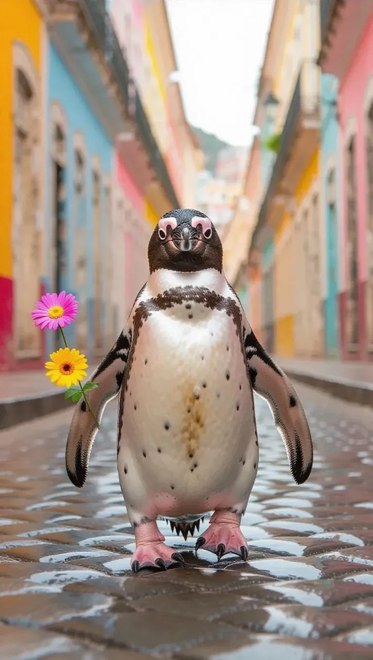 A cheerful penguin waddles through the colorful streets of Rio de Janeiro, Brazil, holding a small flower in one flipper.