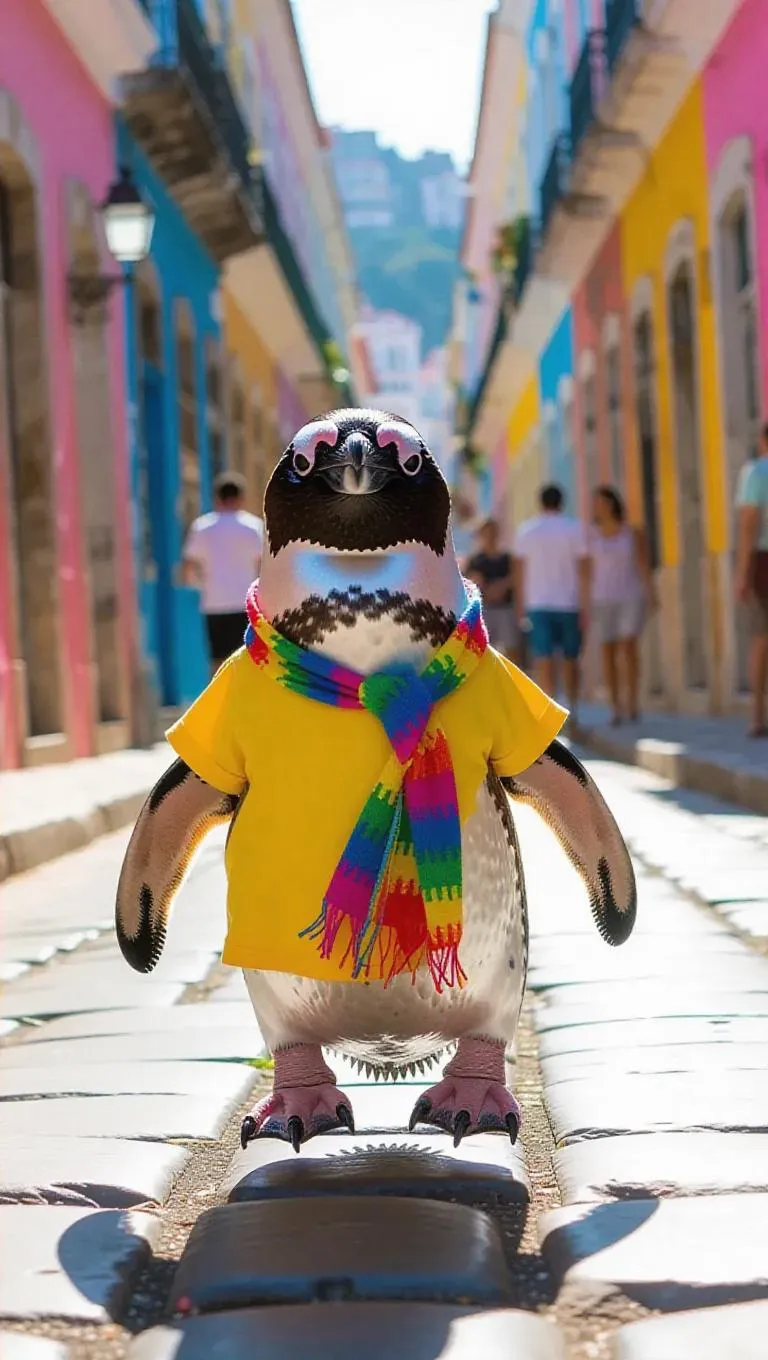 A cheerful penguin waddles through the colorful streets of Rio de Janeiro, Brazil, wearing a bright yellow shirt and a colorful scarf, its feathers glistening in the sunlight.