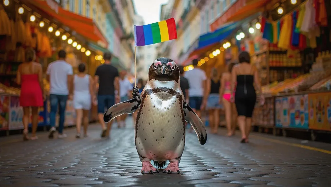A cheerful penguin waddles through the lively markets of Rio de Janeiro, Brazil, holding a small flag in one flipper.