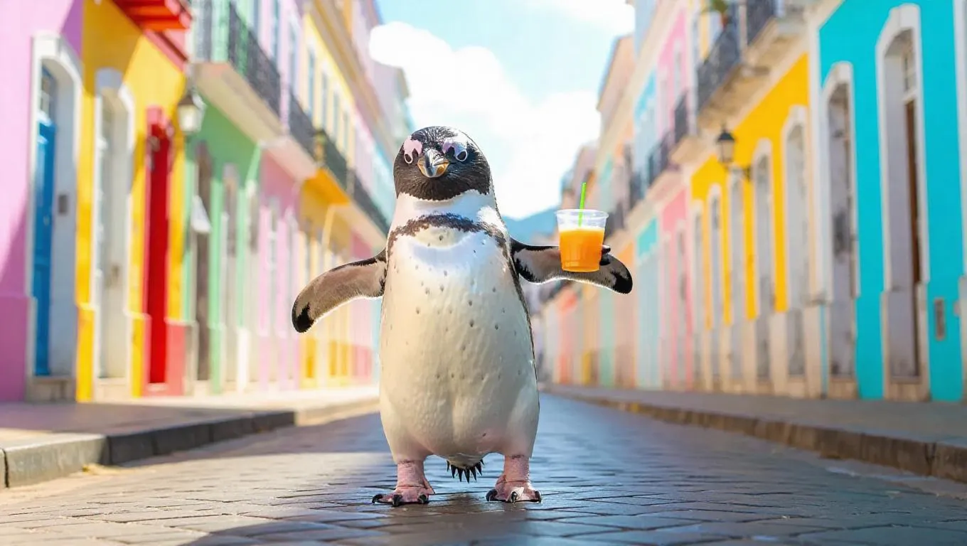 A cheerful penguin waddles through the colorful streets of Rio de Janeiro, Brazil, holding a small cup of juice in one flipper.