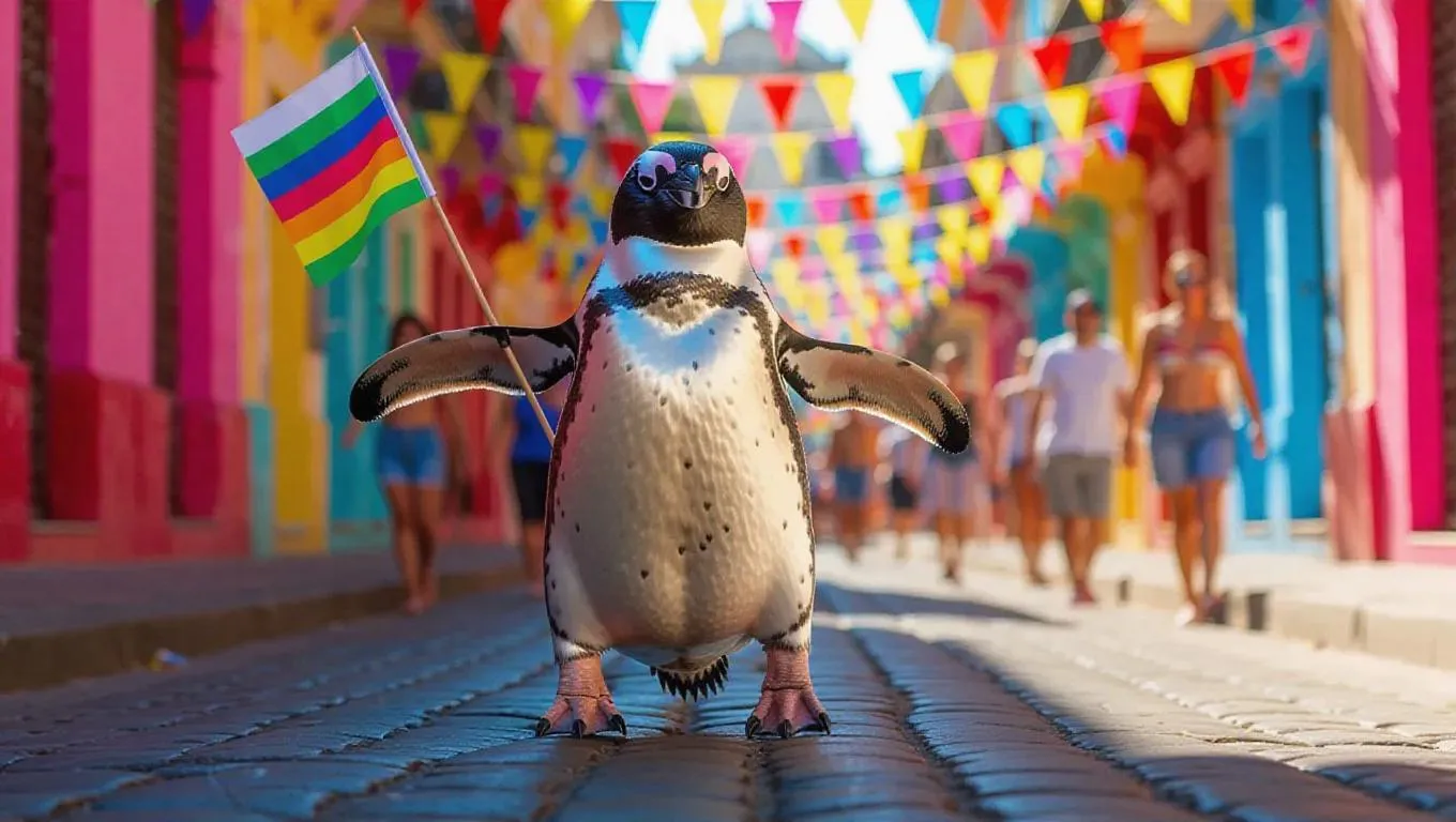 A cheerful penguin waddles through the vibrant carnival streets of Rio de Janeiro, Brazil, holding a small flag in one flipper.