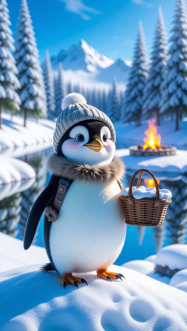 A spirited penguin stands on a snowy knoll, holding a picnic basket in one flipper. The penguin wears a fluffy vest and a beanie, its breath visible in the chilly air. Behind it, an icy wilderness unfolds, dotted with frosted trees and frozen ponds. In the distance, a fire pit flickers warmly under a clear blue sky, creating a cozy atmosphere. The scene is both inviting and picturesque.