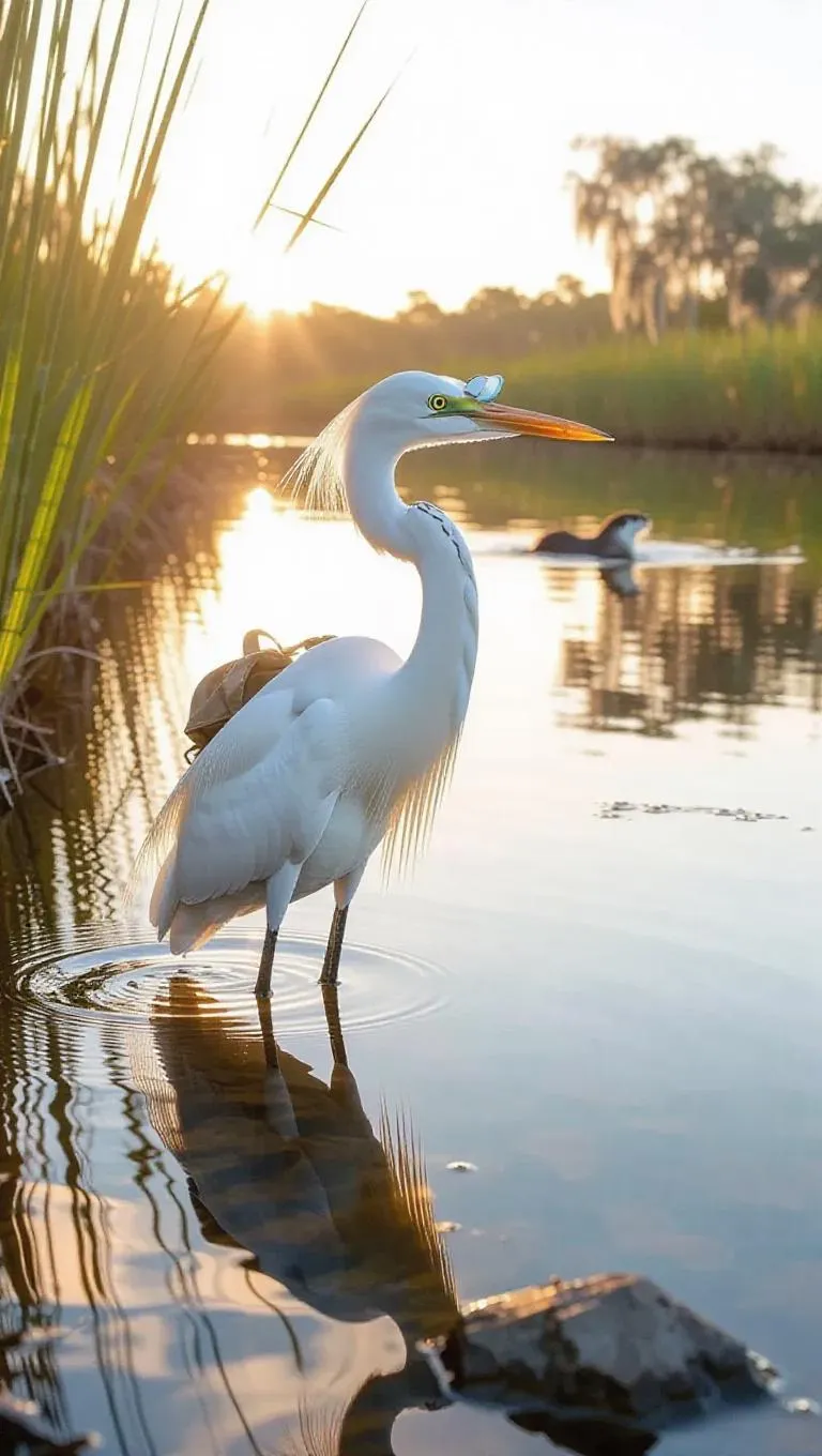 A curious egret stands in the shallow waters of the Everglades, Florida, its white plumage illuminated by the golden sunlight. The egret wears a tiny backpack and a sun visor, its slender legs probing the clear water. Nearby, lush reeds and cypress trees stretch upwards, their reflections dancing on the water's surface. In the distance, a playful otter splashes near a rock, its fur glistening. The air resonates with the calls of singing birds and the soft rustling of foliage.