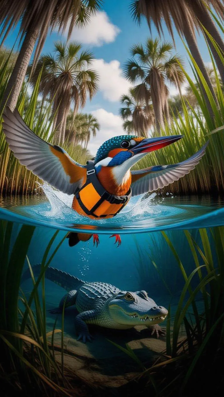 A striking kingfisher dives into the crystal-clear waters of the Everglades, Florida, its vibrant blue and orange feathers flashy in the sunlight. The kingfisher wears a tiny lifejacket and a snorkel, its sharp beak poised for catching fish. Surrounding it, dense reeds and soaring cypress trees frame the scene, their branches moving gently with the breeze. In the distance, an alligator lurks just beneath the surface, its eyes peeking out. The atmosphere is filled with the sounds of water splashing and the rustling of leaves.