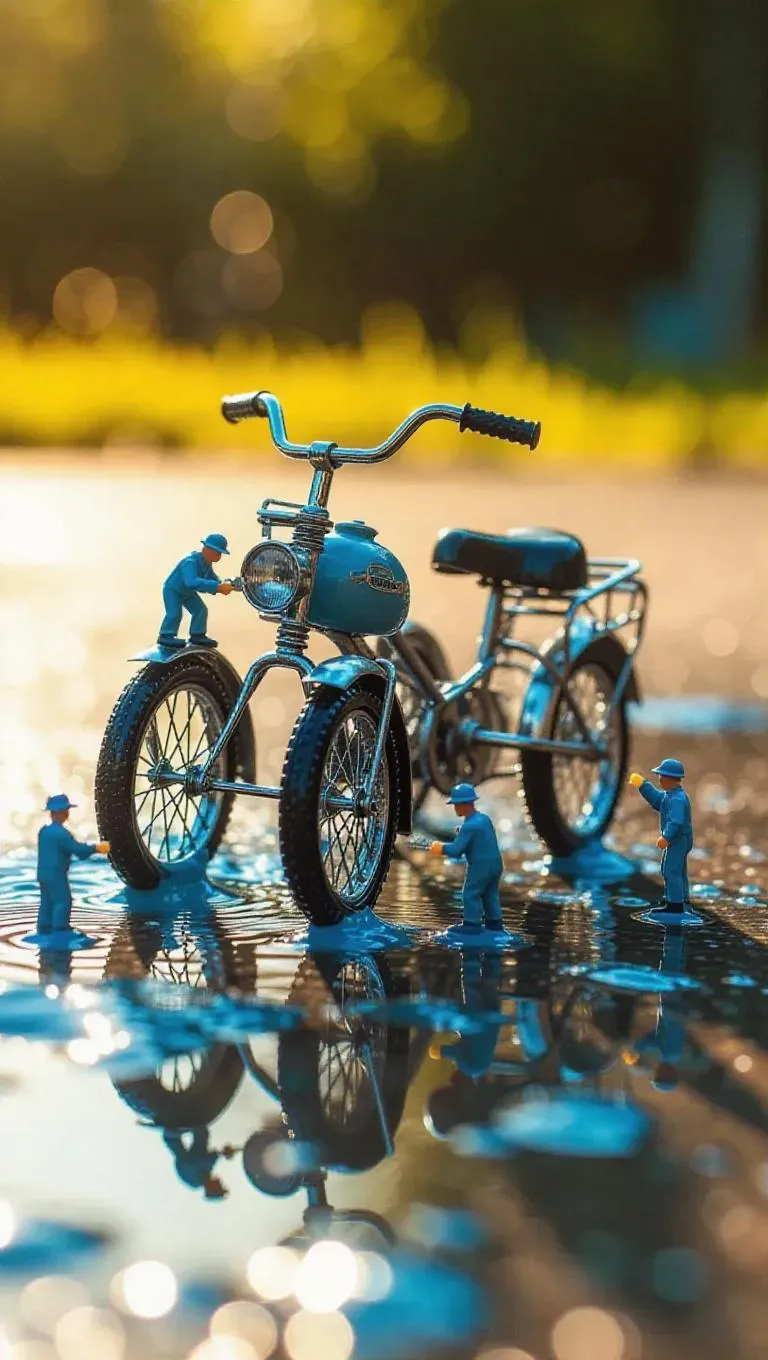 A group of tiny, thumb-sized workers is diligently cleaning a classic, old-fashioned tricycle, which is the centerpiece of the image. The tricycle is parked on a damp surface, possibly a backyard, and has blue splatters on its frame, indicating that it has been recently washed or sprayed. The miniature workers are positioned around the tricycle, some standing and others kneeling. They seem to be focused on their task, using tiny scrubbers and buckets to polish and rinse the vehicle. The surrounding environment features a green, sunny sky, which casts a warm, diffused light over the scene. There are a few scattered puddles and a small plant visible in the background, but no other objects or people are present, and no text or distinctive markings are visible.