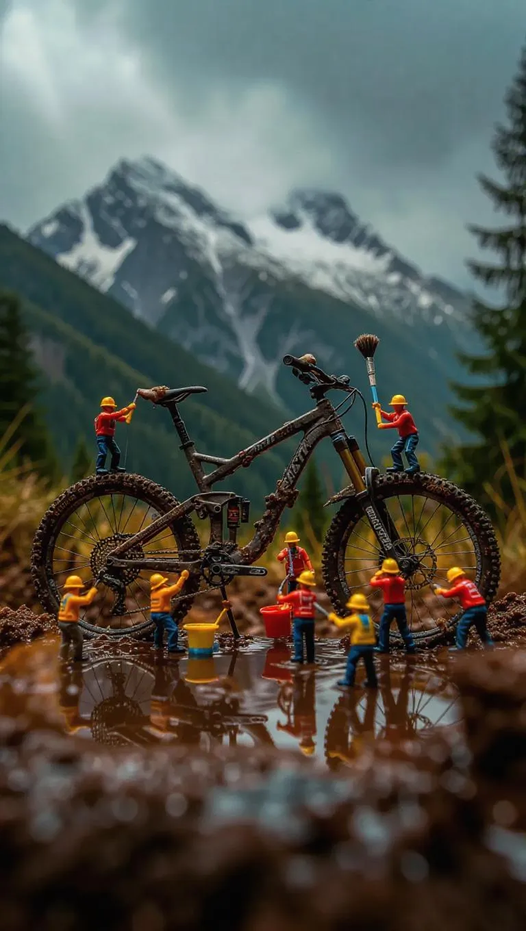 A group of tiny, thumb-sized workers is diligently cleaning a rugged, mountain bike, which is the centerpiece of the image. The bike is parked on a muddy surface, possibly a trail, and has brown splatters on its frame, indicating that it has been recently washed or sprayed. The miniature workers are positioned around the bike, some lifting their tiny arms while others reach for brushes. They seem to be focused on their task, using tiny sponges and buckets to scrub and rinse the vehicle. The surrounding environment is adorned with a cloudy, stormy sky, which casts a moody, diffused light over the scene. There are a few scattered rocks and a small signpost visible in the background, but no other objects or people are present, and no text or distinctive markings are visible.