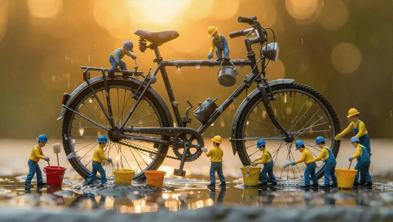 A group of tiny, thumb-sized workers is diligently cleaning a classic, withered bicycle, which is the centerpiece of the image. The bicycle is parked on a damp surface, possibly an old yard, and has gray splatters on its frame, indicating that it has been recently washed or sprayed. The miniature workers are clustered around the bicycle, some leaning against it while others hold cleaning tools eagerly. They appear to be gracefully focused on their task, using tiny sponges and buckets to scrub and rinse the vehicle. The surrounding environment features a tranquil, soft sky, which casts a gentle, diffused light over the scene. There are a few scattered flowers and a small fence visible in the background, but no other objects or people are present, and no text or distinctive markings are visible.