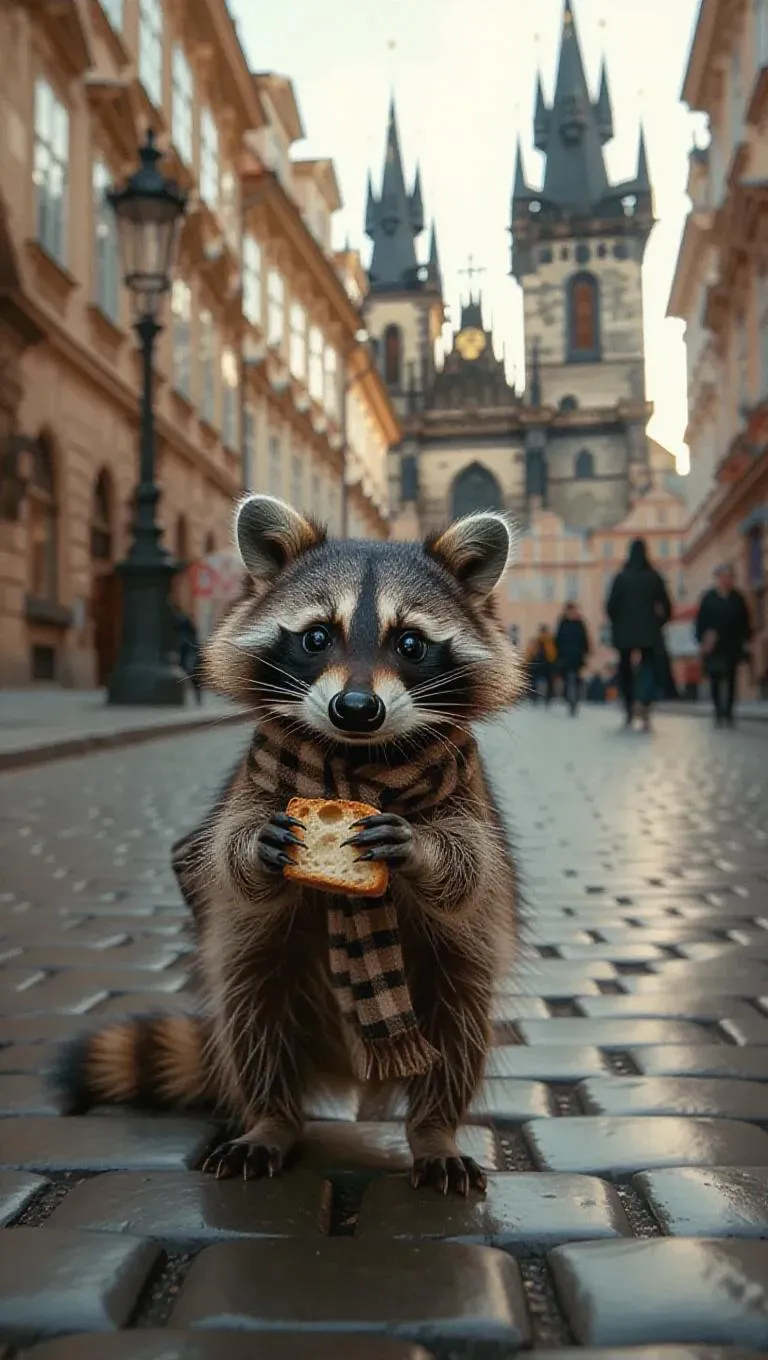 A curious raccoon explores the cobblestone streets of Prague, Czech Republic, its paws clutching a small piece of bread. The raccoon wears a tiny scarf and a pair of boots, its eyes wide with wonder. Around it, historic buildings and Gothic spires line the streets, their surfaces weathered by time. In the distance, the iconic Charles Bridge spans the Vltava River, its statues casting long shadows in the sunlight. The air is filled with the scent of fresh pastries and the sounds of distant music