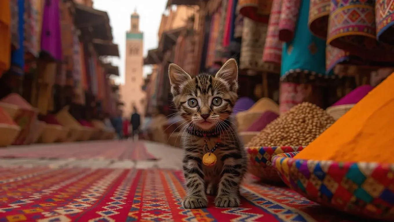 A curious young kitten explores the bustling markets of Marrakech, Morocco, its paws clutching a small piece of dried fruit. The kitten wears a tiny sarong and beaded necklace, its eyes wide with intrigue. Around it, vibrant textiles and fragrant spices fill the air, their colors rich and inviting. In the distance, a grand mosque rises, its minaret piercing the sky. The air is filled with the scent of exotic spices and the sounds of market vendors.