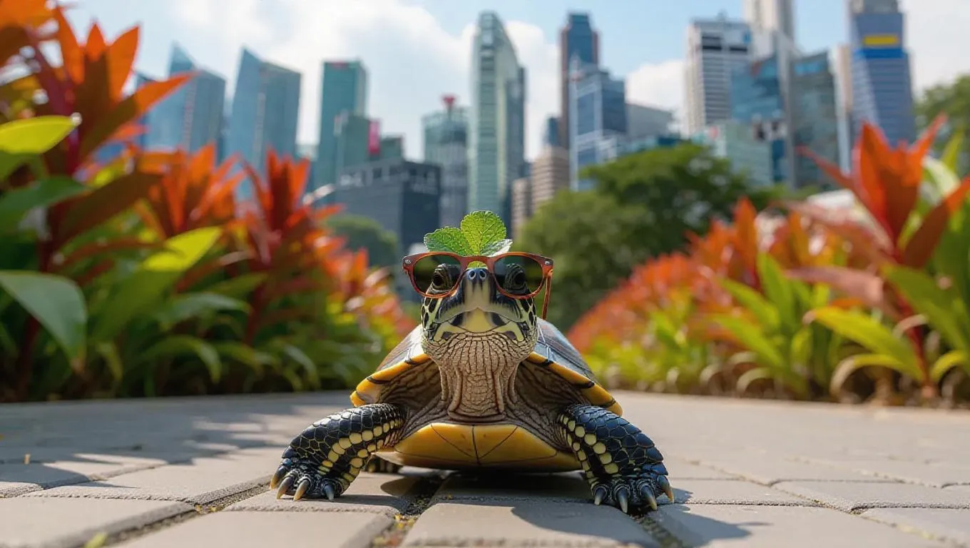 A brave little turtle makes its way through the winding paths of a botanical garden in Singapore, its flippers clutching a small leaf. The turtle wears a tiny sun visor and sunglasses, its eyes sparkling with adventure. Around it, exotic plants and flowers bloom, their colors radiant in the sunlight. In the distance, a modern skyline stands tall, its silhouette striking against the horizon. The air is filled with the scent of blooming flowers and the sounds of rustling leaves.
