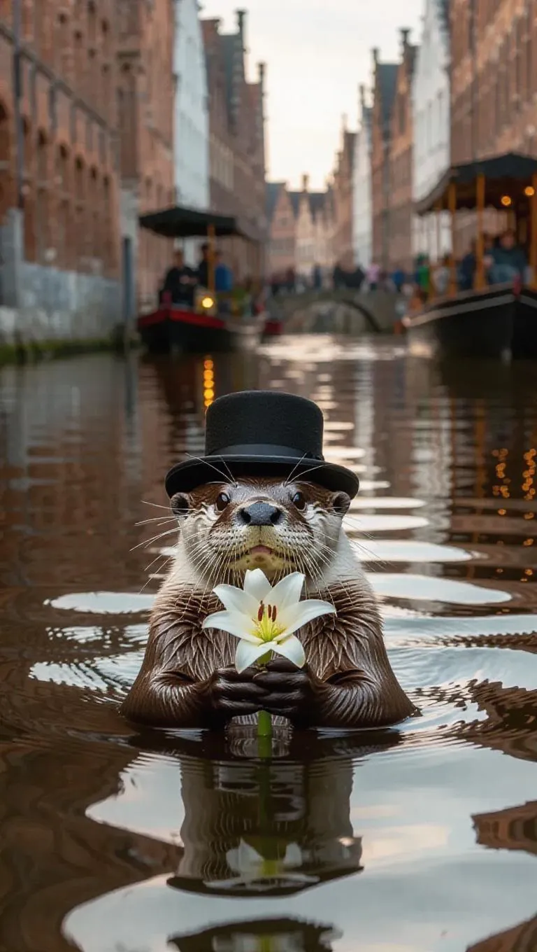 A relaxed otter floats downstream in the canals of Bruges, Belgium, holding a lily in its paws. The otter wears a bowler hat and a neckerchief. Around it, medieval buildings flank the waterways, their reflections muted in the calm water. In the distance, horse-drawn carriages trot by, their wheels clattering on cobblestone. The air is filled with the sounds of clinking glasses and joyous conversation.