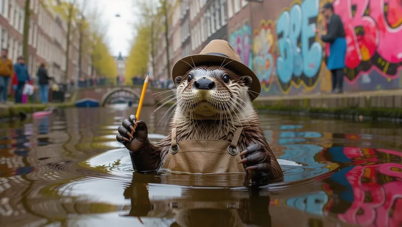 A playful otter swims through the canals of Amsterdam, Netherlands, holding a pencil in its paws. The otter wears a canvas apron and a artist's hat. Around it, vibrant street art decorates the walls, their reflections twisting in the water. In the distance, an artist is painting murals, adding life to the scenery. The air is filled with the sounds of brushed strokes and giggles from onlookers.