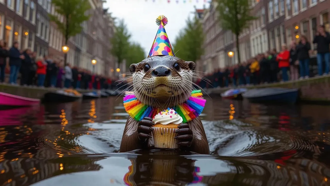 A lively otter paddles along the canals of Amsterdam, Netherlands, grasping a cupcake in its paws. The otter wears a party hat and colorful streamers around its neck. Around it, festive decorations line the streets, their reflections twinkling in the water. In the distance, a parade marches by, music echoing through the air. The atmosphere is jubilant, filled with the sounds of celebration and laughter.
