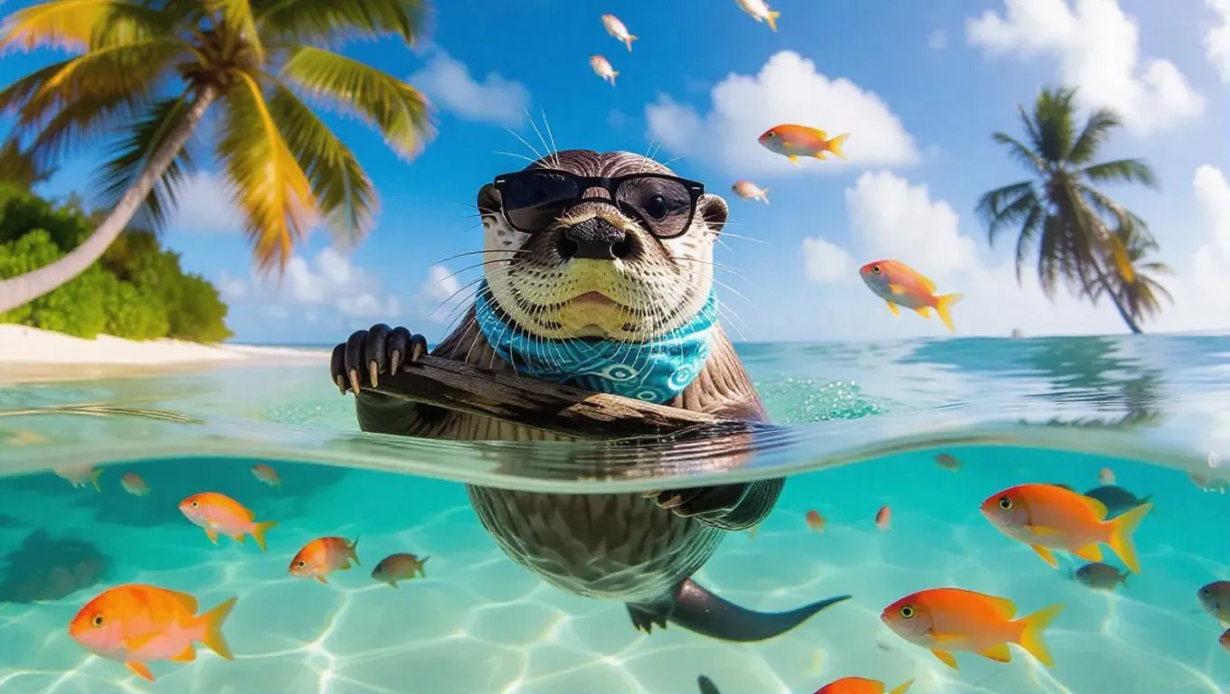 An adventurous otter swims through the crystal-clear waters of the Caribbean, holding a piece of driftwood in its paws. The otter wears a bandana and sunglasses. Around it, tropical fish swim by, their colors bright and lively. In the distance, palm trees sway on a sandy beach, their shadows dancing on the ground. The air is filled with the sounds of the ocean and the gentle rustle of leaves.