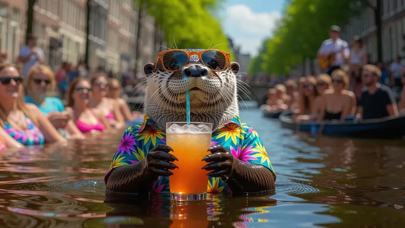 A playful otter drifts down the rivers of Amsterdam, Netherlands, holding a mocktail in its paws. The otter is dressed in a vibrant Hawaiian shirt and sunglasses. Around it, sunbathers line the banks, their reflections highlighting a relaxing summer day. In the distance, a live band plays music, energizing the atmosphere. The air is filled with the sounds of cheerful conversations and clinking glasses.