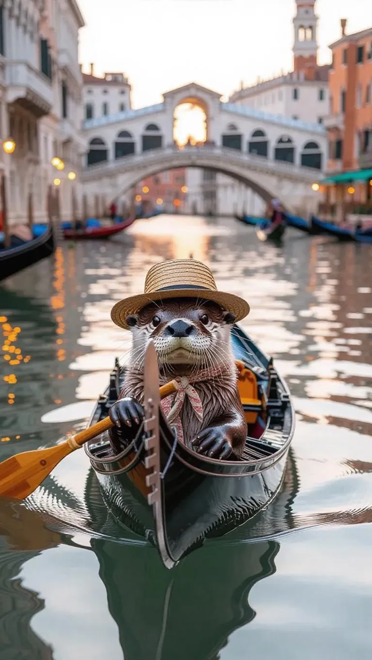 A playful otter floats down the canals of Venice, Italy, holding a gondola paddle in its paws. The otter wears a straw hat and a scarf tied around its neck. Around it, historic buildings line the waterways, their reflections shimmering in the water. In the distance, the iconic Rialto Bridge spans the canal, its arches lit by the soft glow of lanterns. The air is filled with the sounds of music and the gentle lapping of water against the gondola.
