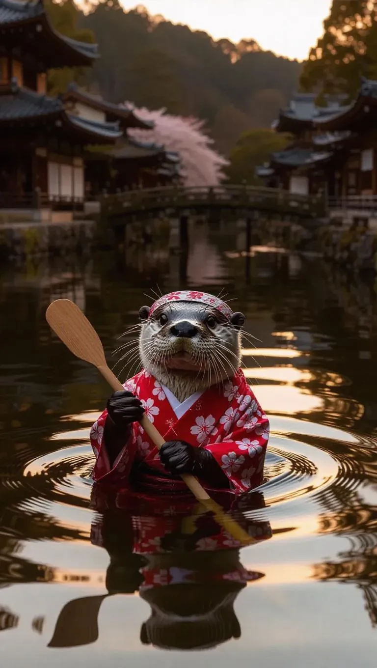 An adventurous otter navigates the waters of Kyoto, Japan, holding a small paddle made of cherry wood in its paws. The otter dons a kimono and a headband adorned with cherry blossoms. All around, traditional wooden houses and shrines dot the landscape, their silhouettes mirrored in the pond. In the distance, a famous stone bridge arches gracefully over the water, bathed in the warm light of the setting sun. The area is serene, echoing with distant temple bells and soft rustlings of leaves.