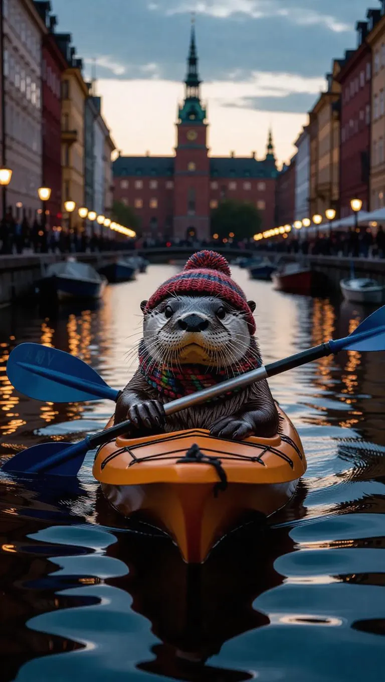 A jovial otter swims through the waterways of Stockholm, Sweden, clutching a kayak paddle in its paws. The otter is adorned with a knitted hat and a colorful scarf. Scenic houses line the shores, their reflections shimmering in the water. In the background, the historic Gamla Stan rises majestically, illuminated by street lamps. The atmosphere is relaxed, with the sound of soft conversations and the gentle rustling of leaves.