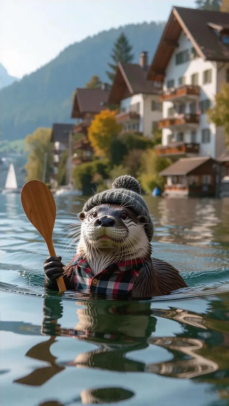 A carefree otter glides through the channels of Zurich, Switzerland, managing a paddle in its paws made of wood. The otter wears a knitted beanie and a plaid shirt. Nestled along the banks, charming Swiss chalets reflect in the water. Farther back, the stunning Lake Zurich sparkles under the sun, with sailboats gliding by. The environment is peaceful, with the soft sounds of chimes and lapping waves filling the air.