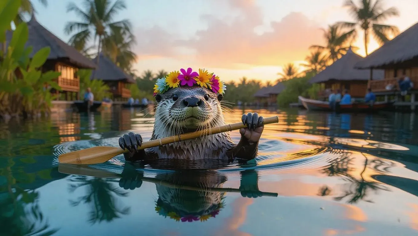 An energetic otter swims along the lagoons of Bali, Indonesia, managing a bamboo paddle in its paws. The otter wears a flower crown and a sarong. Lush tropical plants and wooden bungalows frame the lagoon, with reflections of palm trees dancing in the water. In the distance, traditional boats glide by, brightly colored against the sunset sky. The atmosphere is vibrant, filled with the sound of waves and laughter.