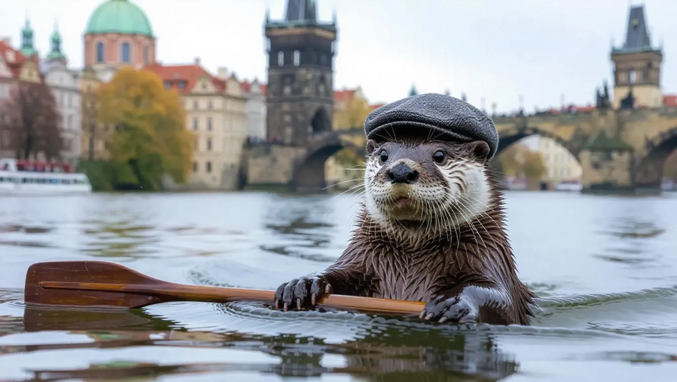 A sprightly otter glides through the rivers of Prague, Czech Republic, wielding a slender paddle in its paws. The otter wears a vintage cap and a light scarf. Gothic architecture flourishes along the waterway, their intricate forms reflected in the water. In the background, the iconic Charles Bridge stands tall, adorned with streetlights. The air is filled with the melody of street musicians and the buzz of tourists.