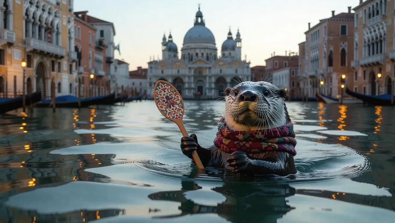 A spirited otter swims through the waters of Venice, Italy, holding a decorative paddle in its paws. The otter is adorned with a patterned shawl and a small hat. Enchanting buildings flank the water, their grand reflections shimmering below. In the background, the majestic Basilica stands, bathed in soft candlelight. The air is filled with the soft music of a gondolier singing.