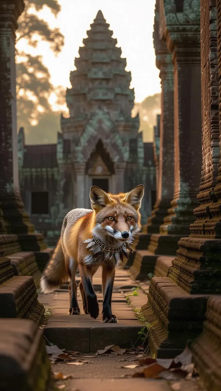 A clever fox trots through the ancient ruins of Angkor Wat in Cambodia, grasping a silver trinket in its jaws. The fox is adorned with a feathered collar and a belt around its waist. Surrounding it, ornate stone artistry and rising temples peak from the jungle, their surfaces cloaked in moss and leaves. Far away, dawn breaks, illuminating the ruins and the surrounding underbrush with a warm orange hue. The fragrance of rich earth and past lives fills the atmosphere.