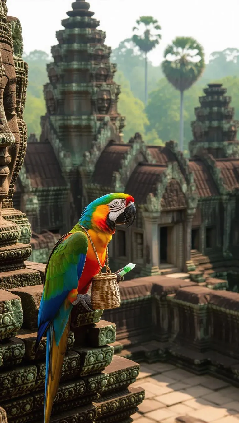 A lively parrot flits through the ancient ruins of Angkor Wat in Cambodia, holding a jade amulet in its beak. The parrot is dressed in a tiny vest and a woven bag at its side. All around, intricate stone reliefs and towering towers rise from the jungle, their surfaces wrapped in greenery and flowers. In the distance, midday approaches, casting a bright light over the ruins and the dense forest. The air is vibrant with the scent of tropical flora and adventures.
